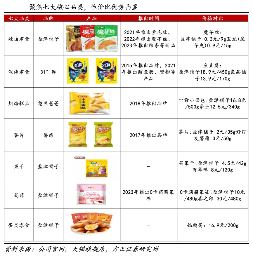 經典案例:根據公司官網、天貓旗艦店、方正證券研究所等綜合資訊表明,自 2021 年按照“多品牌、多品類、 全渠道、全產業鏈、(未來)全球化”中長期戰略發力以來,鹽津鋪子公司做大做強“鹽津 鋪子”辣鹵零食、“31°鮮”深海零食,“憨豆爸爸”烘焙食品、“薯之惑”焙烤薯片、蛋類零食“蒟蒻滿分”蒟蒻果凍、果干堅果七大核心品類,產品品牌定位“好吃不貴,國民零食”,實現高品質+高性價比的產品。
