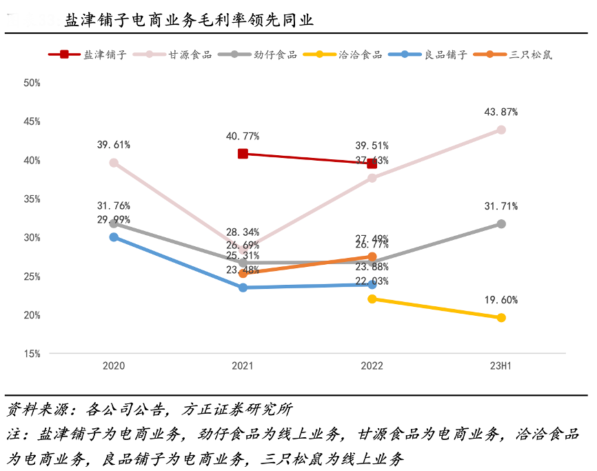 經典案例:根據各公司公告、方正證券研究所等綜合資訊表明,鹽津鋪子 95%的產品均為自研自產,通過長期生產經驗的不斷積累,積極引進數字化賦能生產,公司在供應鏈方面具備核心優勢,面臨線上平臺的激烈競爭,公司仍能保持較高的毛利率水平。2021/2022 年公司電商業務毛利率分別為 40.77%和 39.51%,在行業中處于領先地位。