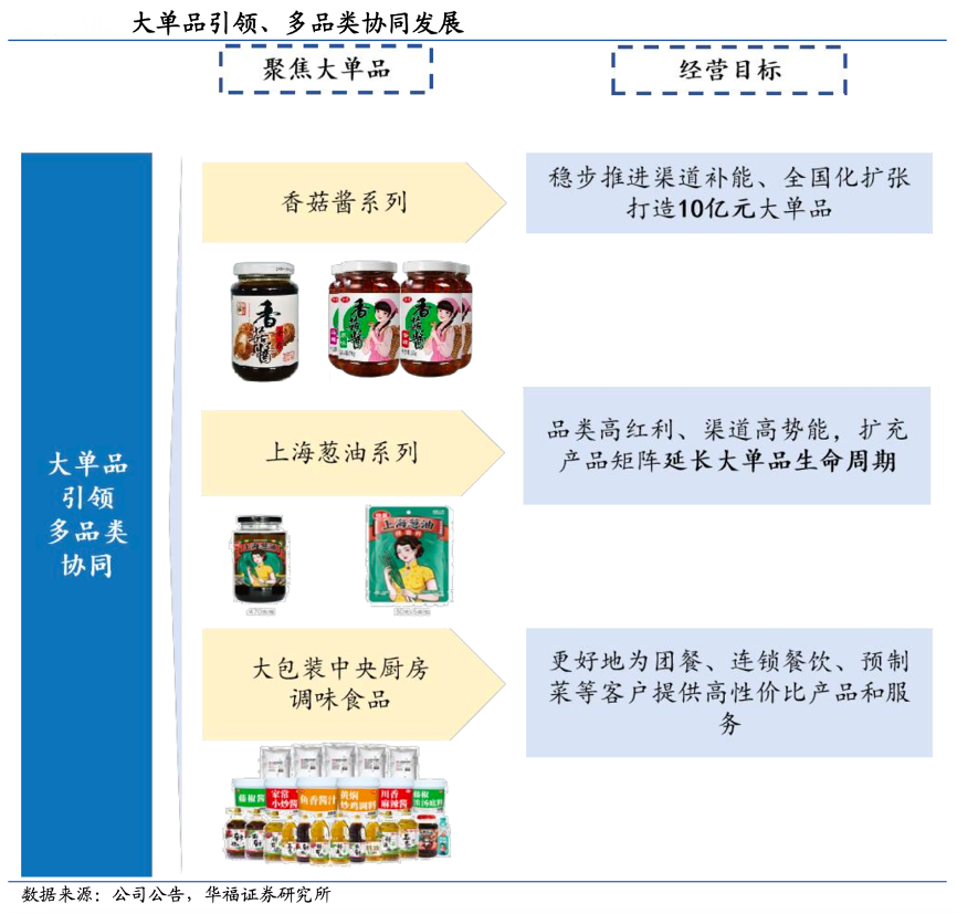 經(jīng)典案例:根據(jù)公司公告、華福證券研究所等綜合資訊表明,仲景食品公司踐行大單品引領(lǐng)、多品類協(xié)同發(fā)展的產(chǎn)品戰(zhàn)略,其中公司第一單品香菇醬仍具備區(qū)域拓展、渠道填補(bǔ)的空間,目標(biāo) 10 億,而公司階段性快增預(yù)期基于上海蔥 油持續(xù)放量以及對線上渠道紅利的攫取,調(diào)配業(yè)務(wù)跟隨大 B 擴(kuò)張同時固老開新,未來保持穩(wěn)健增長態(tài)勢。
