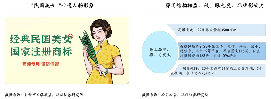 經(jīng)典案例:根據(jù)公司公告、仲景京東旗艦店、華福證券研究所等綜合資訊表明,仲景食品公司繼續(xù)深化“采蘑菇的小姑娘”、“民國美女”的品牌形象,以高品牌辨識度區(qū)隔其他白牌及模仿型競爭對手,通過持續(xù)的投流引流實(shí)現(xiàn)線上渠道的放量與霸榜,截止 23 年末公司擁有 31 家 線上自營店鋪,3 個直播間,合作達(dá)人超 4 萬人,已形成覆蓋貨架電商、興趣電商和到店到家的銷售矩陣。