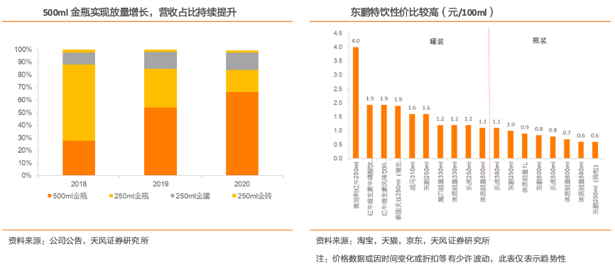 經(jīng)典案例:根據(jù)公司公告、淘寶、天貓、京東、天風(fēng)證券研究所等綜合資訊表明,東鵬飲料差異化定價(jià),價(jià)格帶向下兼容。公司推出 5 元/瓶的 500ml 大容量金瓶后,由于終端零售指導(dǎo)價(jià)格相較其他品類單位容量的價(jià)格更低,性價(jià)比更高,銷量迅速增長(zhǎng),500ml 金瓶也 迅速成為公司營收占比最高的單品。