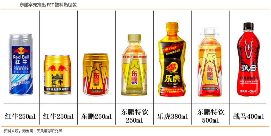 經(jīng)典案例:根據(jù)淘寶網(wǎng)、天風(fēng)證券研究所等綜合資訊表明,2009 年東鵬公司首創(chuàng) PET 塑料瓶包裝和獨(dú)特的防塵 蓋專利設(shè) 計(jì),以差 異化的產(chǎn)品包 裝在市 場(chǎng)中獨(dú) 樹一 幟,打破 了能量 飲料產(chǎn) 品罐裝 包裝的 市 場(chǎng)局限,迅速打開了市場(chǎng),250ml 金瓶特飲也成為了公司高辨識(shí)度的經(jīng)典產(chǎn)品。2018 年,500ml 金瓶逐步在全國范圍內(nèi)上市,其成功填補(bǔ)了市場(chǎng)主要品牌在大容量能量飲料品類的缺口,滿足了消費(fèi)者對(duì)于大容量產(chǎn)品的差異化需求。