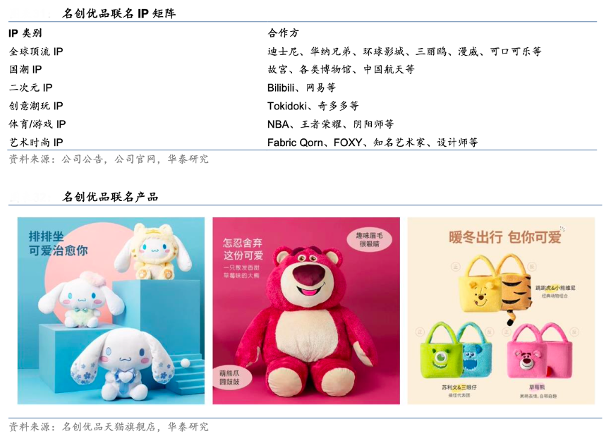 經典案例:根據公司公告、公司官網、名創優品天貓旗艦店、華泰研究等綜合資訊表明, 2016 年以來名創優品陸續和粉紅豹、Hello Kitty、芝麻街、Universal、迪士尼、故宮、NBA、漫威、中國航天、陰陽師、Bilibili 等知名 IP 推出聯名產品,截至 2023 年 6 月 30 日,名創優品已與 82 個 IP 進行聯名合作。