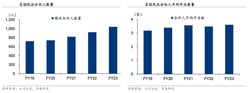 經典案例:根據公司公告、華泰研究等綜合資訊表明,名創優品品牌與合伙人形成長久牢固的合作關系。FY2019 至 FY2023,名創優品合伙人從 721 人增至 1,040 人,平均每名合伙人開店數量從 3.2 家增長至 3.6 家。截至 2023 年 6 月 30 日,名創優品 860 個合伙人中有有 550 個合伙人投資名創優品加盟店超過 3 年。