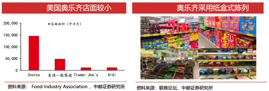 經典案例:根據Food Industry Association、聯商論壇、中郵證券研究所等綜合資訊表明,奧樂齊獨特陳列方式最大限度利用空間,高坪效孕育優良盈利模式。“門店雖小,五臟俱全”,其采用獨樹一幟的“紙盒式”陳列,在有限空間內擺放足夠多商品提高坪效:奧樂齊在2016年坪效已接近1.3萬美元/平方米,高于大多數同行。