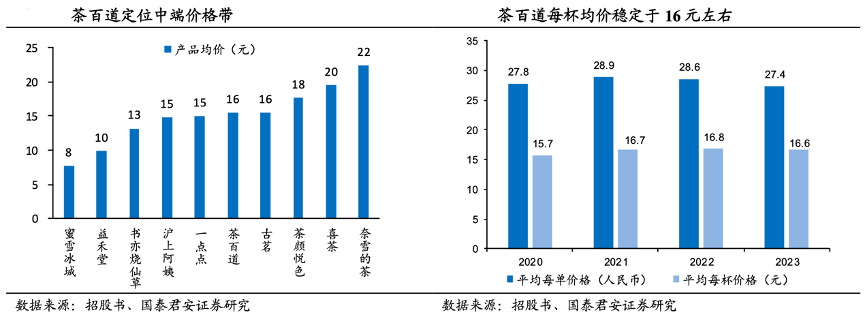 經典案例:根據招股書、國泰君安證券研究等綜合資訊表明,茶百道定位中端價格帶,性價比優勢顯著。茶百道每杯均價穩定在 16 元左右, 原材料環節嚴格把控,多為原葉和鮮果,產品力穩定。