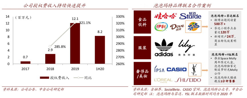 經典案例:根據公司公告、金融界、SocialBeta、CASIO官網、泡泡瑪特公眾號、中金公司研究部等綜合資訊表明,泡泡瑪特2020 年 6 月注 冊會員數達到 360 萬,且粉絲年齡以 15-35 歲為主,覆蓋較多高學歷、高收入優質消費群,2017-2019 年其授權費收入從 74.5 萬元提升至 1,210 萬元,無形資產從 258 萬元提升至 1,862 萬元,其中 IP 授權增加是主要原因之一。目前其已與快消、美妝、服裝、日用等領域的眾多頭部品牌進行聯名合作。