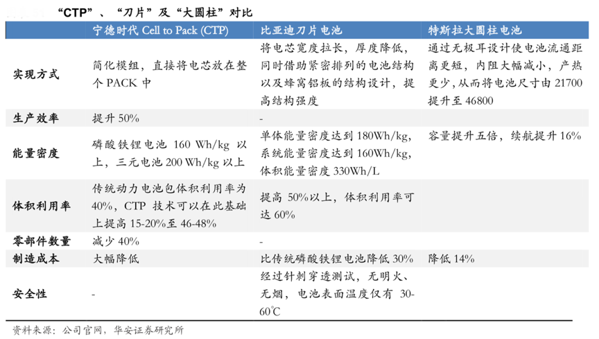 經(jīng)典案例:根據(jù)公司公告、華安證券研究所等綜合資訊表明,傳統(tǒng)的電池包是由電芯和金屬蓋板端板、線束、粘合劑、導(dǎo)電膠、模組控制單元等部件組合形成一個電池模組,再由模組構(gòu)成電池包(Pack)。電池的技術(shù)不光在于材料體系,從電芯到模組到 PACK 層面的設(shè)計都有很大的差異化和發(fā)展空間。無論是特斯拉的“無極耳”、 “大圓柱”,還是比亞迪的“刀片”和寧德時代的“CTP”,均為結(jié)構(gòu)上的設(shè)計變化。