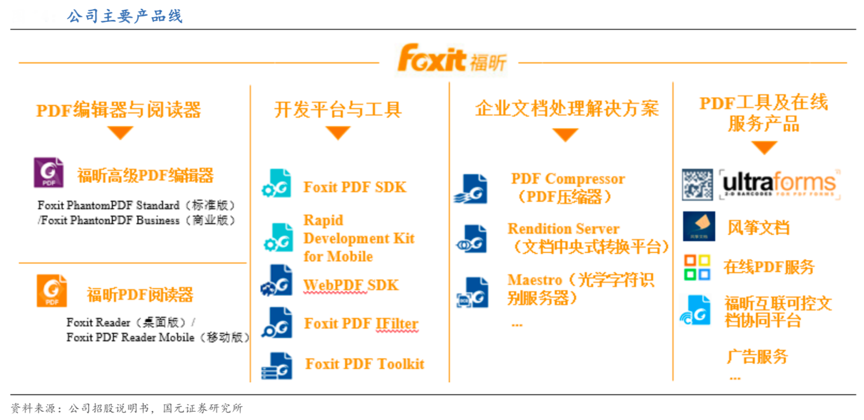 經(jīng)典案例:根據(jù)公司招股說明書、國元證券研究所等綜合資訊表明,福昕軟件公司提供涵蓋 PDF 文檔整個生命周期的各類產(chǎn)品和服務(wù),主要包括 PDF 編輯器與閱讀器產(chǎn)品、開發(fā)平臺與工具以及基于企業(yè)內(nèi)部服務(wù)器及云端的 PDF 相關(guān)獨立產(chǎn)品,產(chǎn)品及服務(wù)廣泛應(yīng)用于政府、能源、出版、金融、法律、教育、醫(yī)療、生產(chǎn)制造、建筑等眾多行業(yè)和領(lǐng)域。