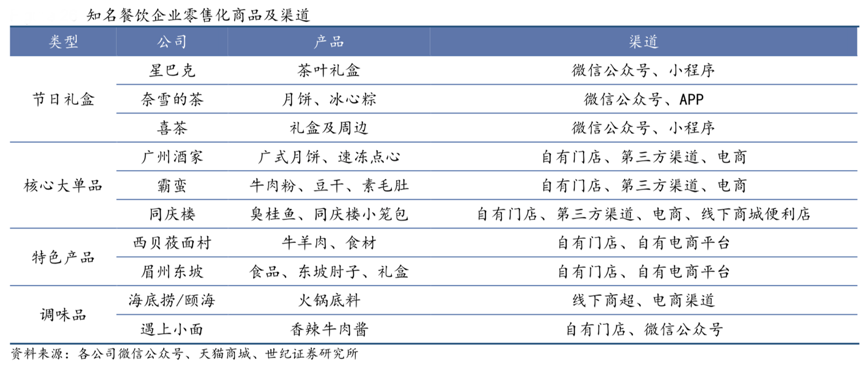 經典案例:根據各公司微信公眾號、天貓商城、世紀證券研究所等綜合資訊表明,餐飲企業零售化發展初期主要以禮盒套裝、速凍米面形式進行售賣,如廣州酒家推出月餅禮盒等,廣州酒家禮盒銷售占到了整體銷售的20%。銷售渠道方面,同慶樓采取線上+線下融合的方式,業務全面覆蓋“堂食+外賣+零售”,將餐飲體驗、食品銷售融為一體。