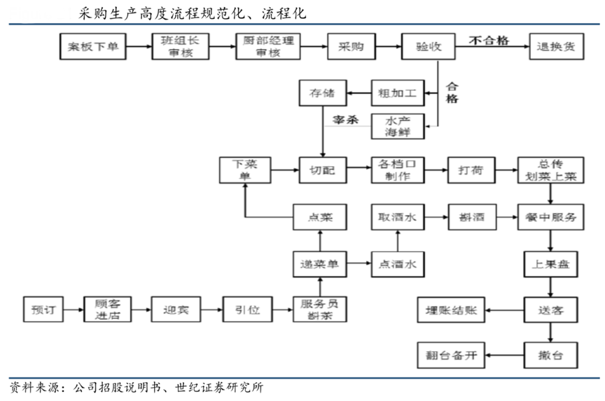 經典案例:根據公司招股說明書、世紀證券研究所等綜合資訊表明,同慶樓公司總部對門店在服務流程、店面管理等可復制環節進行標準化精細化管理,制定了《服務部工作手冊》、《廚部管理手冊》、《宴會管理指導書》等,對不同崗位服務人員的服務流程和行為進行標準化管理。其設采購部,所有原材料由公司統一采購,門店電沒有采購權,采購生產高度流程規范化、流程化。