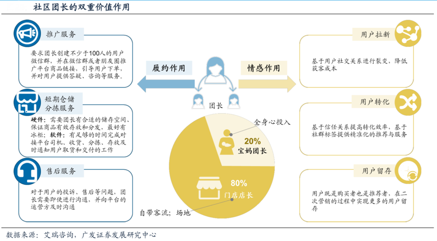 經(jīng)典案例:根據(jù)艾瑞咨詢、廣發(fā)證券發(fā)展研究中心等綜合資訊表明,結(jié)合美團優(yōu)選團長端申請合同明文規(guī)定,團長需要承擔(dān)推廣、分揀、短 期儲存、售后四個具體職責(zé),來滿足用戶相關(guān)需求。其中的推廣服務(wù)最為顯著,美團優(yōu)選要求 團長創(chuàng)建不少于100人的用戶微信群,并在微信群或者朋友圈推廣平臺商品鏈接,引導(dǎo)用戶下單,并對用戶提供答疑、咨詢等服務(wù)。