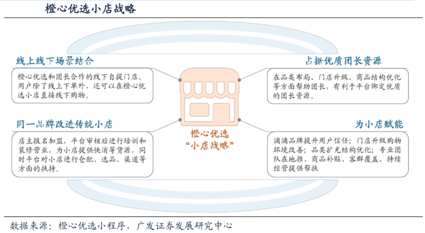 經典案例:根據橙心優(yōu)選小程序、廣發(fā)證券發(fā)展研究中心等綜合資訊表明,2020年10月,橙心優(yōu)選在成都開出第一家線下自營實體店——橙心優(yōu)選超市,以期通過將線上引流至線下,完成線上拼團、線下自主挑選的閉環(huán)。與傳統(tǒng)夫妻老婆店相比,橙心優(yōu)選小店具有更專業(yè),線上數據更豐富的優(yōu)勢,可以幫助平臺占據優(yōu)勢團長資源。
