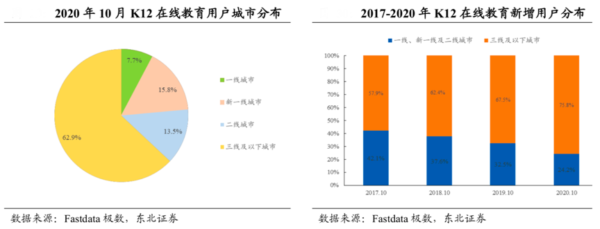 經典案例:根據Fastdata極數、東北證券等綜合資訊表明,用戶生源結構方面,學而思網校的付費用戶主要來自一二線城市,疫情發生前 80% 左右的用戶來自一二線城市,20%左右來自低線城市。跟誰學的用戶分布相對更均勻,2019年上半年,新生中約一半來自一二線城市,另一半來自低線城市。新東方 在線則雙管齊下,中小學網校面向一二線城市用戶,東方優播則主攻低線城市。