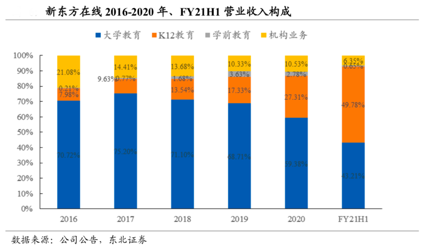 經典案例:根據公司公告、東北證券等綜合資訊表明,從收入結構來看,大學教育是新東方在線公司的基石業務,2020財年占公司營收達59.38%,K12 教 育近年來快速擴張,2020 財年占公司營收達 27.31%,同比增長9.99pct,自 2019 財年超越機構業務成為營收規模第二大的業務。