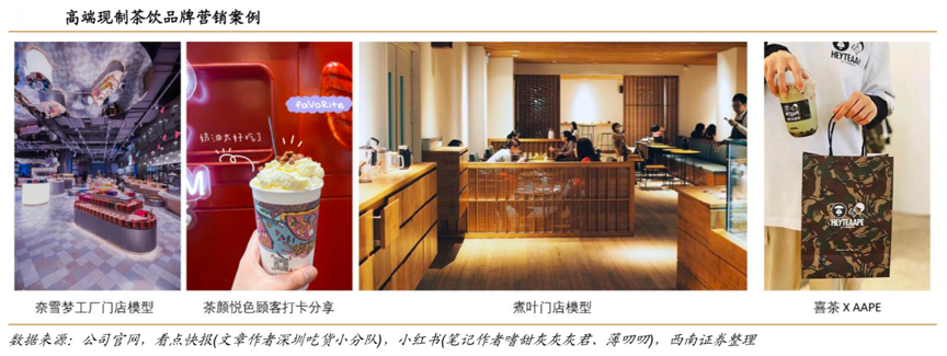 經(jīng)典案例:根據(jù)公司官網(wǎng)、看點(diǎn)快報(bào)、小紅書(shū)、西南證券等綜合資訊表明,高端現(xiàn)制茶飲品牌正積極打造年輕人的“社交貨幣”,獲得品牌流量。喜茶黑金、奈雪夢(mèng)工廠(chǎng)等超級(jí)大店模型適合拍照打卡,成為適合閑暇社交的“第三空間”。高端價(jià)位+新潮產(chǎn)品,讓好看好拍好分享的現(xiàn)制茶成為年輕人的社交貨幣;喜茶、奈雪與NIKE、AAPE 等知名品牌一年十余次的跨界聯(lián)名增強(qiáng)了品牌背書(shū),同時(shí)互換了流量、粉絲,而煮葉通過(guò)煮茶師專(zhuān)業(yè)耐心的演示講解、茶顏悅色通過(guò)“永久求償權(quán)”和貼心的顧客服務(wù)與消費(fèi)者之間形成了品牌獨(dú)特的待客 標(biāo)簽。
