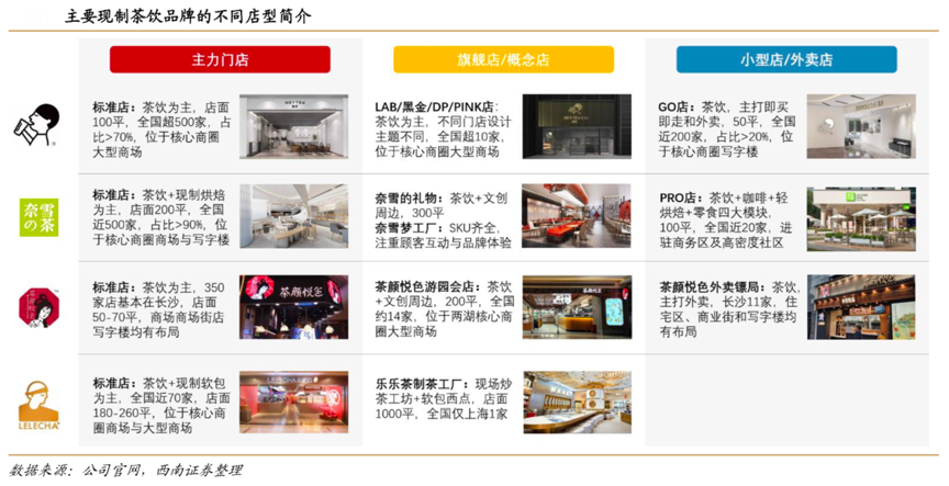 經(jīng)典案例:根據(jù)公司官網(wǎng)、西南證券等綜合資訊表明,部分現(xiàn)制茶飲品牌嘗試多種店型運(yùn)作,逐步優(yōu)化渠道組合。其主力店以外的門(mén)店拓展分為兩個(gè)大類(lèi),第一類(lèi)以展示品牌形象、增加消費(fèi)者互動(dòng)為目的,這類(lèi)店型面積大、設(shè)計(jì)交互感強(qiáng),如奈雪 夢(mèng)工廠(chǎng)、茶顏悅色游園會(huì);第二類(lèi)以提升單店效率為目的,側(cè)重即買(mǎi)即走和外賣(mài)業(yè)務(wù),門(mén)店面積小、讓高端品牌將渠道拓展至辦公場(chǎng)所、社區(qū)的同時(shí),如奈雪 PRO、喜茶 GO等。
