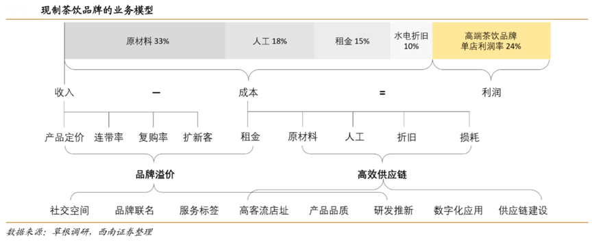 經典案例:根據草根調研、西南證券等綜合資訊表明,現制茶飲產品性質決定了其產品同質化高、復購頻率較咖啡低、30 歲+消費群體滲透率偏低的特點,因此需要通過品牌營銷、入駐核心商圈獲得高客流、通過新品開發拉新客提復購,來保障同店訂單量及利潤空間。而在成本端,品牌溢價獲得租金優勢,規模化采購和數字化應用優化成本結構。