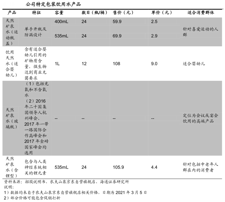 經典案例:根據招股說明書、農夫山泉京東自營旗艦店、海通證券研究所等綜合資訊表明,農夫山泉公司自2015 年起為細分的消費人群及特殊飲用場景,推出了飲用天然水(適合 嬰幼兒)、針對喜愛運動的人群的天然礦泉水(運動瓶蓋)、針對定位為會議或宴會活動飲用的高端產品、以及針對包括中老年人在內的消費者的天然礦泉水(含鋰型)。