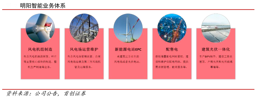 經(jīng)典案例:根據(jù)公司公告、首創(chuàng)證券等綜合資訊表明,明陽智能以實(shí)現(xiàn)能源的綠色、普惠和智慧化為使命,以打造清潔能源全生命周期價(jià)值鏈管理與系統(tǒng)解決方案的供應(yīng)商為愿景,目前已逐步發(fā)展成為國(guó)內(nèi)領(lǐng)先、全球具有重要影響力的智慧能源企業(yè)集團(tuán)。主營(yíng)業(yè)務(wù)包括新能源高端裝備制造、新能源電站投資運(yùn)營(yíng)及智能管理業(yè)務(wù)。