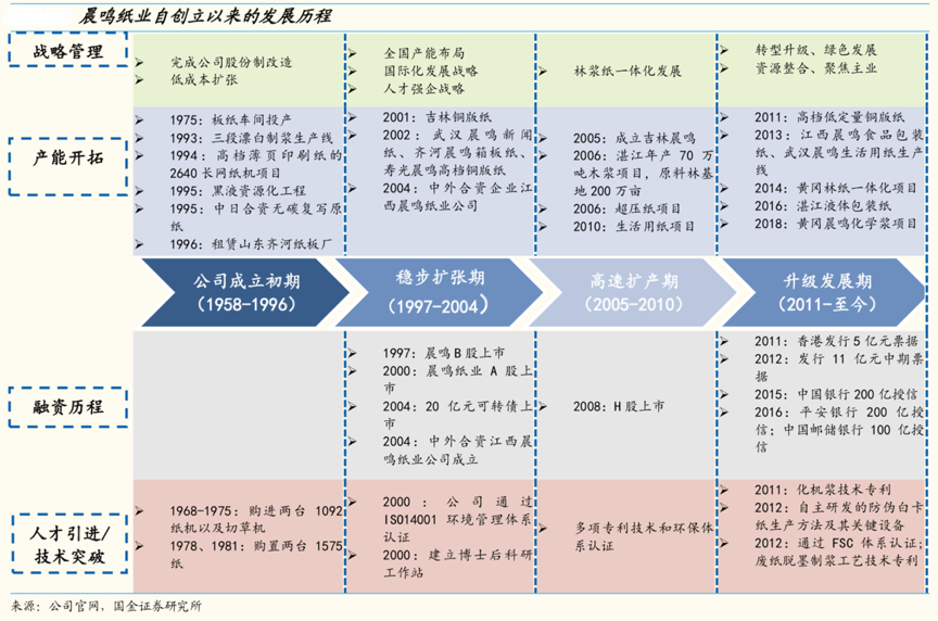 經典案例:從公司官網、國金證券研究所等綜合資訊表明,晨鳴紙業成立于 1958 年,歷經六十余年的發展,現已成為以造紙為主業,金融、 礦業、林業、物流等協同發展的大型企業集團。其造紙業務涵蓋高檔膠版紙、 白卡紙、銅版紙、生活紙等系列,截至 2019 年底公司擁有造紙產能 680 萬噸, 自制木漿產能 430 萬噸。