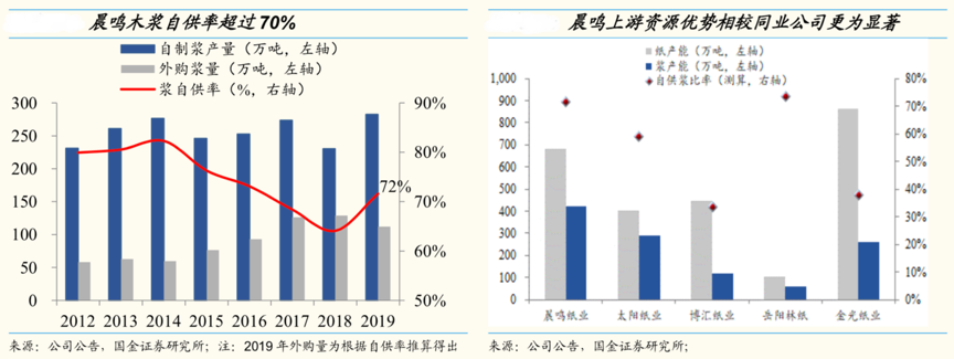 經典案例:從公司公告、國金證券研究所等綜合資訊表明,截至 2020 年底,晨鳴擁有林地面積 85 萬余畝,自制漿產能達到 430 萬噸,木漿自供率達到 72%,居于行業領先地位。