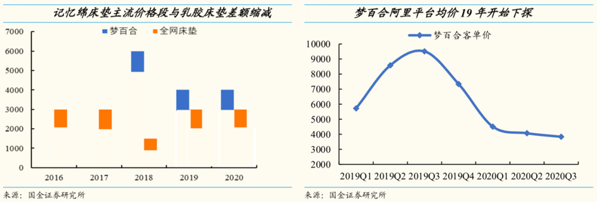經典案例:根據公司公告、國金證券研究所等綜合資訊表明,2019 年以來以夢百合為主的企業持續優化產品結構疊加主要原料成本下降,記憶綿床墊產品主流價格段有所下降,以阿里平臺為例,記憶綿床墊主流價格段從5000-6000 元下降至 3000-4000 元,逐步靠近乳膠床墊的 2000-3000 元主流價格段,其中夢百合平均單價也從2019 年下半年開始逐步下調。產品覆蓋面更廣,定價逐漸親民令記憶綿床墊加速滲透邁出關鍵一步。