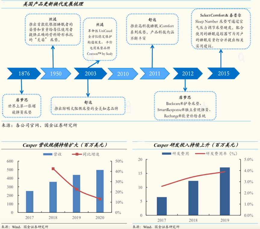 經典案例:根據各公司官網、wind、國金證券研究所等綜合資訊表明,近年來,國外品牌 Casper 快速發展,近年來其逐步提高研發費用,研發創新一方面使得 Casper 床墊將頂層的優質乳膠泡沫和中間層的優質記憶泡沫融合 在一起,確保身體在睡眠過程中不同角度的支撐和舒適度,產品體驗感領先同行,另一方面設計使得 Casper 床墊可用迷你冰箱尺寸的箱子包裝運輸,顯著降低運輸成本。