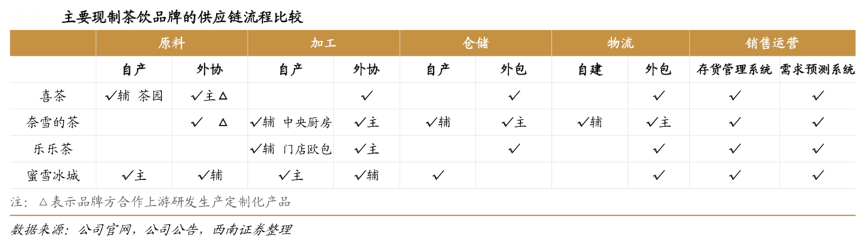 經典案例:根據公司官網、公司公告和西南證券等綜合資訊表明,高端現制茶飲品牌在生產物流端多以“輕資產外協”為主,其更注重原材料的定制化以及后端大數據的預測分析,其中“蜜雪冰城”的供應鏈建設更為完善,具備向同業開放供應鏈能力。