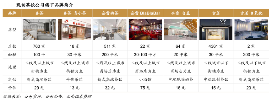 經典案例:根據公司官網、公司公告和西南證券等綜合資訊表明,深耕一線城市的高端網紅品牌對客流、客單量的要求更高,奈雪、喜茶的推新速度在 1-1.2 款/周,除了茶飲相關產品,兩者還在瓶裝水、餐飲副 牌的領域試水經營。而小店經營的模式并不適合提供多樣化的 SKU,茶顏悅色、蜜雪冰城一年上新款式不到 5 個。