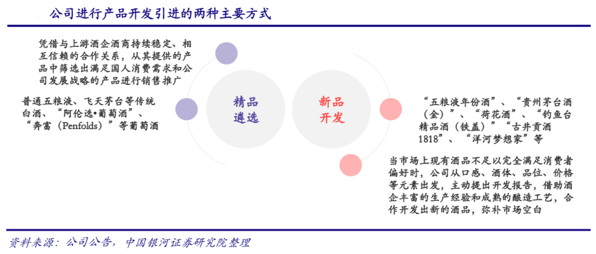 經(jīng)典案例:根據(jù)公司公告、中國(guó)銀河證券研究院等綜合資訊表明,華致酒行公司產(chǎn)品開發(fā)引進(jìn)主要通過“精品遴選”和“新品開發(fā)”兩種途徑,一方面從上游產(chǎn)品供給中直接挑選符合市場(chǎng)發(fā)展規(guī)律的合適酒品,另一方面根據(jù)下游需求反向定制,雙管齊下的搭建覆蓋全面的產(chǎn)品線。