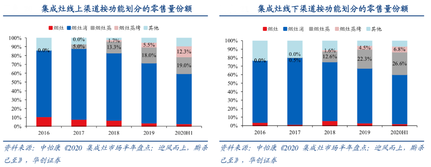 經(jīng)典案例:根據(jù)中怡康、華創(chuàng)證券等綜合資訊表明,蒸箱集成灶推出后,市場(chǎng)經(jīng)過短期教育普及,自 2017 年起份額開始迅速擴(kuò)張,并作為除煙灶消之外的第二大品類快速覆蓋市場(chǎng),隨后蒸烤款也逐步跟進(jìn)。據(jù)中怡康披露,至 2020H1 集成 灶線上、線下的蒸箱款集成灶銷量占比分別達(dá)到 19%和 26.6%,并憑借功能集成保持較強(qiáng)替代性。