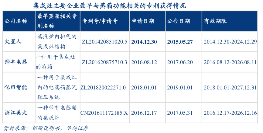 經(jīng)典案例:根據(jù)招股說明書、華創(chuàng)證券等綜合資訊表明,相較第二代集成灶的煙+灶+消毒柜的套系組合,火星人敏銳洞察消費(fèi)潛在需求,認(rèn)為“蒸”作為中國(guó)傳統(tǒng)烹飪習(xí)慣將是集成灶新代際的切入點(diǎn),在很早開始布局蒸箱功能的研 發(fā)。對(duì)比各集成灶企業(yè)披露的蒸箱款相關(guān)專利,火星人于 2014 年底即已率先擁有蒸箱功能技術(shù),憑此成為業(yè)內(nèi)最早一批布局蒸箱款集成灶的企業(yè)。