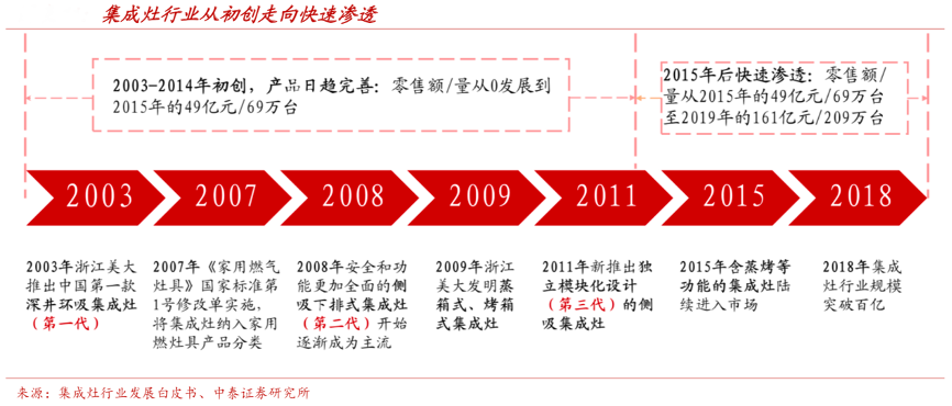 經(jīng)典案例:根據(jù)集成灶行業(yè)發(fā)展白皮書、中泰證券研究所等綜合資訊表明,此前集成灶因燃氣容易卷入油煙機內(nèi)部,容易引起爆炸等安全性問題,第二代側(cè)吸突破了集成灶過去“不安全”這一核心痛點,第三代“模塊化”則成為推動滲透加速關鍵。模塊化首先解決了整機清洗、維修困難,同時 2015 年起模塊化整合“蒸”、“烤”功能的集成灶大批進入市場 (此前不模塊化基本只集成消毒柜),蒸烤優(yōu)秀功能體驗直接推動滲透加速。
