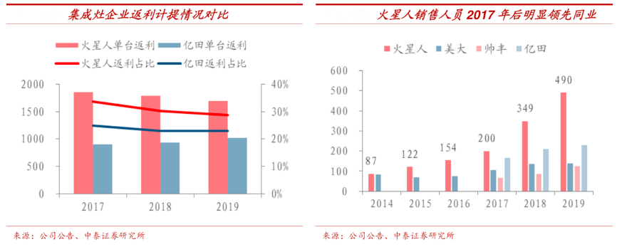 經典案例:根據公司公告、中泰證券研究所等綜合資訊表明,火星人的差異化定價給其售后留下了充足的利潤空間,同時憑借這一賣“售后服務”模式迅速脫穎而出建立口碑。目前其可提供免費上門,購機三年內兩次免費清洗等。售后由經銷商承擔,所以火星人此前給經銷商毛利空間高,下圖火星人返利比例高于同業可以驗證。2018年上線的“火星人極速服務小哥”將部分售后收歸自營,返利比例相對下降但銷售人員數量從 17 年 200 人增至 490 人,銷售費用也相應上升。