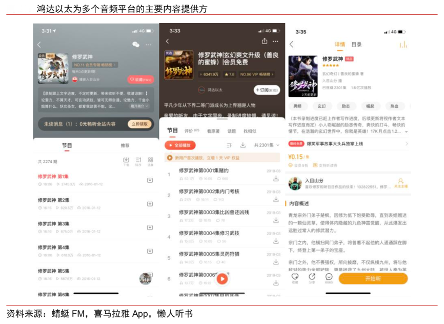 經(jīng)典案例:根據(jù)蜻蜓FM、喜馬拉雅App、懶人聽(tīng)書、中信證券研究部等綜合資訊表明,鴻達(dá)以太憑借海量的獨(dú)家有聲內(nèi)容形成護(hù)城河,成為喜馬拉雅、蜻蜓 FM、懶人聽(tīng)書、酷我暢聽(tīng)等音頻平臺(tái)的主要內(nèi)容提供方之一。鴻達(dá)以太旗下作品《修羅武神》、《權(quán)利巔峰》在蜻蜓 FM、喜 馬拉雅、懶人聽(tīng)書、酷我暢聽(tīng)的總播放量均超過(guò)25 億次。