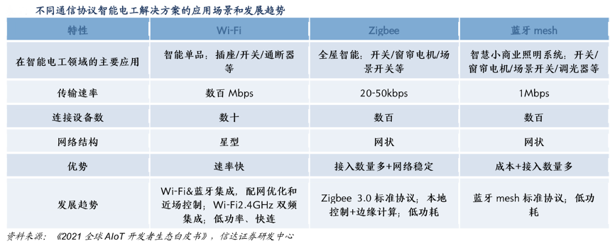 典型現象:根據《2021全球AIoT開發者生態白皮書》、信達證券研發中心等綜合資訊表明,從需求側來看,電工產品作為人們生活和工作空間中 的基礎設施,有著極大的智能化發展空間。隨著 AIoT 技術的發展,Wi-Fi、Zigbee、藍牙 mesh、Sub-G 以及 NB- IoT 等多種通信連接協議為空間智能交互愿景的實現添磚加瓦。