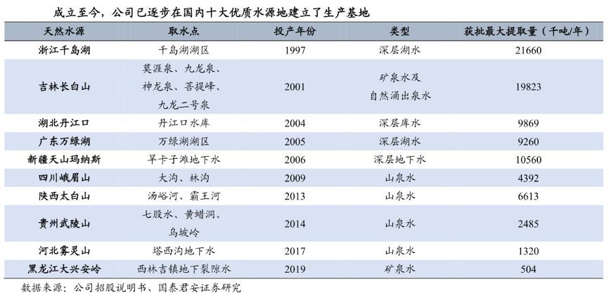 經典案例:根據公司招股說明書、國泰君安證券研究等綜合資訊表明,農夫山泉公司目前主打的天然水和天然礦泉水產品對水質要求極高。從最初的浙江千島湖到 2019 年投產的黑龍江大興安嶺生產基地,其已在國內成功布局了十大優質水源地。這些水源地不僅水質出眾、含有天然的礦物元素,而且儲水量充足。同時,分散各地的水源地可以覆蓋全國市場供應,從而降低運輸成本。