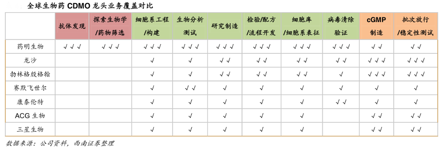 經(jīng)典案例:根據(jù)公司資料、西南證券等綜合資訊表明,對(duì)比龍沙、勃林格殷格翰、賽默飛世爾等海外生物藥CDMO 龍頭,藥明生物的業(yè)務(wù)覆蓋了從單抗發(fā)現(xiàn)到商業(yè)化生產(chǎn)的各個(gè)階段,從研發(fā)端和生產(chǎn)端進(jìn)行了全面的覆蓋,尤其是在單抗、雙抗、ADC 藥物發(fā)現(xiàn)端,以及細(xì)胞系工程及開(kāi)發(fā)方面具備優(yōu)勢(shì)。