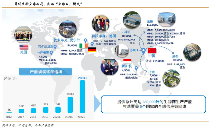 經(jīng)典案例:根據(jù)公司資料、西南證券等綜合資訊表明,藥明生物在中國(guó)的無(wú)錫、上海、石家莊、成都均有廠房布局設(shè)計(jì),國(guó)內(nèi)產(chǎn)能預(yù)計(jì)能達(dá)到 215 噸。根據(jù)“全球雙廠”策略,藥明生物開(kāi)始布局海外工廠,首先動(dòng)工愛(ài)爾蘭基地,此外,美國(guó)伍斯特、新加坡等地也均有產(chǎn)能布局。通過(guò)覆蓋四個(gè)國(guó)家全球供應(yīng)鏈網(wǎng)絡(luò),保證客戶產(chǎn)品的全球性供應(yīng),并能積極應(yīng)對(duì)潛在風(fēng)險(xiǎn)。藥明生物產(chǎn)能規(guī)模逐年提升,2019 年,產(chǎn)能達(dá) 52 噸,預(yù)計(jì) 2022 年可大幅提升至 280 噸。