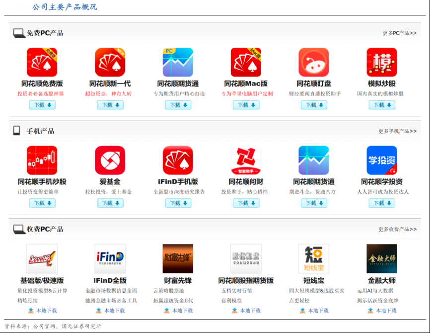 經典方法:根據公司官網、國元證券研究院等綜合資訊表明,同花順公司以自身數據積累與多年服務 C 端客戶的行業經驗,產品主要可分為 PC 端產品及手機端產品。其中 PC 端產品可分為免費產品與付費產品。PC 端產品主要有同花順財經網頁、同花順期貨通、同花順盯盤、 模擬炒股等免費產品,以及 iFinD 全版、Level-2、財富先鋒、短線寶及金融大師等付費產品。移動端產品主要包括愛基金、手機炒股、iFinD 手機版等。