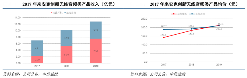 經典案例:根據公司公告、中信建投等綜合資訊表明,安克創新公司無線音頻類主要是無線耳機和無線音箱。無線耳機收入由 2017 年 2.20 億元增至 2019 年 7.53 億元, CAGR 為 85%,是其增長最快的細分產品之一;無線音箱收入由 2017 年 4.81 億元增至 2019 年 5.27 億元,主打便攜、交互體驗與光影效果,市場表現良好。