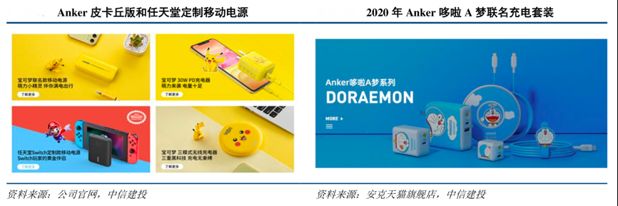經典案例:根據公司官網、安克天貓旗艦店、中信建投等綜合資訊表明,安克創新公司通過全球知名跨界 IP 合作,樹立年輕化、時尚感品牌形象,例如Anker于 2017 年拿到精靈寶 可夢的品牌授權,推出精靈球版和皮卡丘版定制移動電源;2018 年與任天堂聯合推出定制款移動電源;2020年推出哆啦 A 夢聯名充電套裝等。