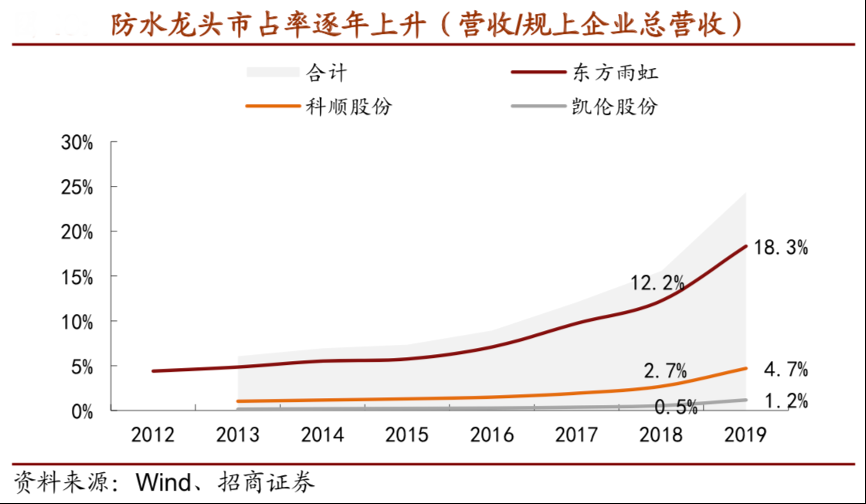經(jīng)典案例:根據(jù)wind、招商證券等綜合資訊表明,以規(guī)上企業(yè)營(yíng)收計(jì),2019 年建筑防水行業(yè) CR3 達(dá) 24%;其中第一龍頭東方雨虹市占率為 18.3%,超過(guò)科順股份(4.7%)、凱倫股份(1.2%)的市占率總和,行業(yè)格局呈現(xiàn)一超多強(qiáng)。