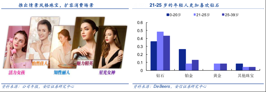 經典案例:根據公司年報、De Beers、安信證券研究中心等綜合資訊表明,周大生公司不斷豐富產品線,在2015-2016 年推出了情景風格珠寶系列,以優雅、浪漫、迷人、摩登、自然五大產品風格,精準定位活力女孩、怡然佳 人、知性麗人、魅力精英、星光女神五大消費人群,擴展婚戀外消費需求。根據 De Beers,目前我國鉆石消費場景中“表達愛意”動機占比明顯高于美、日等發達國家,日常裝飾需求 相對較低,目前國內 90%鉆石品牌仍僅做婚戀方向產品。