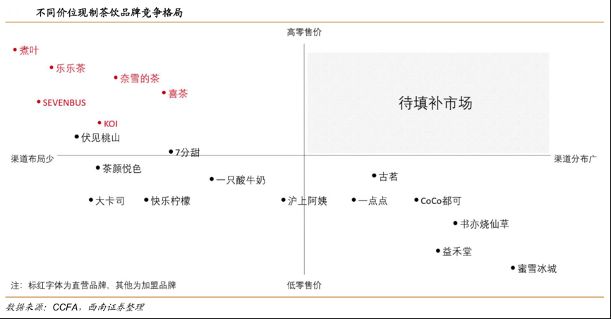 經(jīng)典案例:根據(jù)CCFA、西南證券等綜合資訊表明,不同價位品牌錯位競爭,高端品牌龍頭渠道擴(kuò)容空間存。性價比品牌通過小店加盟主攻下沉市場。2015 年前成立的性價比品牌如 Coco 都可、 蜜雪冰城主打低線市場,產(chǎn)品研發(fā)創(chuàng)新能力不如新興品牌,依靠加盟模式已實現(xiàn)全國性布局。