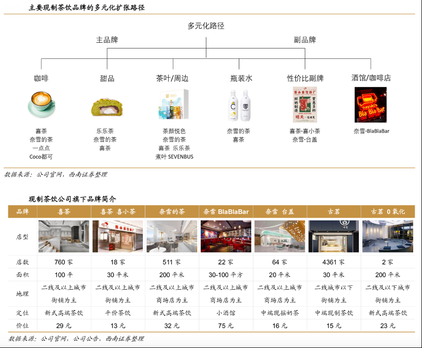 經(jīng)典案例:根據(jù)公司官網(wǎng)、公司公告、西南證券等綜合資訊表明,深耕一線城市的高端網(wǎng)紅品牌對客流、客單量的要求更高,奈雪、喜茶的推新速度在 1-1.2 款/周,除了茶飲相關產(chǎn)品,兩者還在瓶裝水、餐飲副牌的領域試水經(jīng)營。而小店經(jīng)營的模式并不適合提供多樣化的SKU,茶顏悅色、蜜雪冰城一年上新款式不到 5 個。