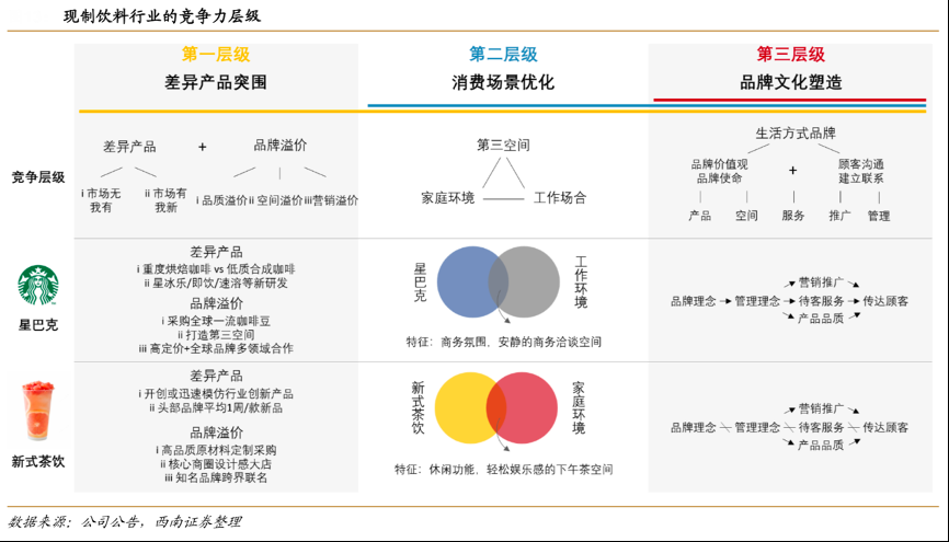 經(jīng)典案例:根據(jù)公司公告、西南證券等綜合資訊表明,借鑒星巴克的發(fā)展歷程,現(xiàn)制飲料品牌競爭力的可劃分為三個層級:第一層級靠差異化產(chǎn)品突圍,第二層級靠消費場景與消費者建立聯(lián)系,第三層級靠傳播品牌理念,培養(yǎng)品牌“調(diào)性”或“氣質(zhì)”,融入消費者的日常生活成為生活方式品牌。