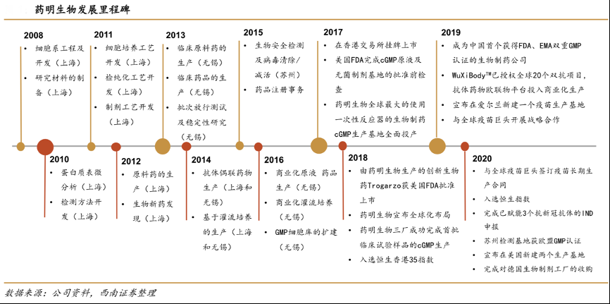 經典案例:根據公司資料、西南證券等綜合資訊表明,藥明生物公司建立于 2008 年,最初為客戶提供細胞系培育和蛋白質分析服務。后來業務擴大到生物新藥發現、生物新藥開發、生物檢測以及 GMP 生產,成長為一家真正意義上提供從概念到商業化一站式服務、開放式生物制藥技術平臺公司。