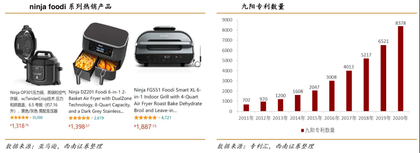 經典案例:根據亞馬遜、專利匯、西南證券等綜合資訊表明,2018 年,Ninja 在北美市場推出與九陽合作創新產品 Foodi 系列,融合 TenderCrisp 技術。 2019 年和 2020 年,Ninja Foodi 系列持續推出新品, 包括 Ninja Foodi 強力破壁加工機、智能 XL 六合一室內烤架等等,助力 Ninja Foodi 系列產 品在北美保持了強勢的增長勢頭。截至2020 年末,九陽已擁有 8378 項專利技術。